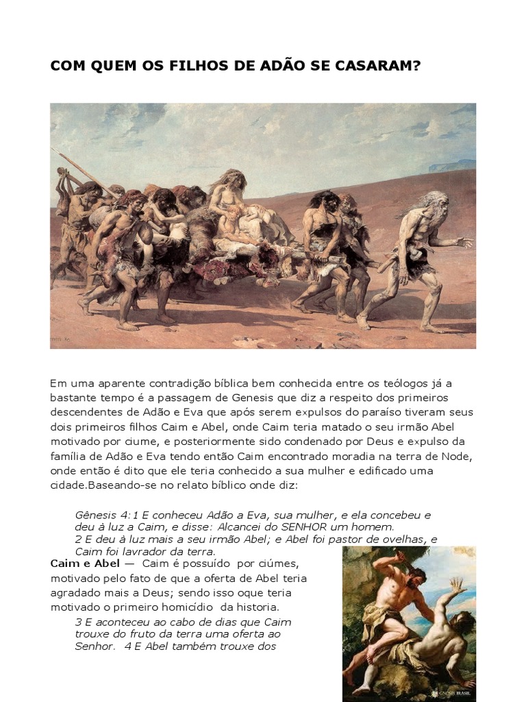 Como Os Filhos De Adão E Eva Se Reproduziram. WebA Bíblia não explica como se desenvolveu a descendência de Adão e Eva. Sabemos que Adão e Eva tiveram muitos filhos (Gn 5, 4), dos quais os primeiros foram Caim e Abel (Gn 4, 1-2), e conhecemos... WebQuando lembramos que o próprio casal Adão e Eva eram irmãos, não ficamos surpresos que os filhos deles também se casaram entre si. Isso não era proibido por Deus até..
